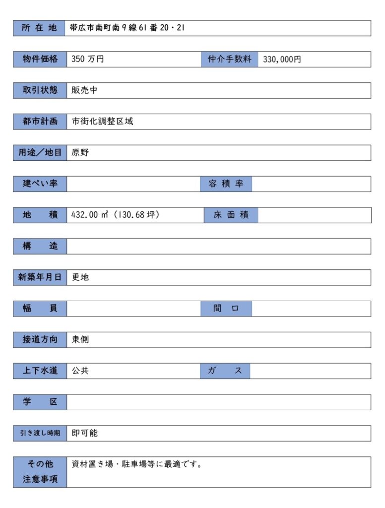帯広市南町南9線 売土地(市街化調整区域) 350万円