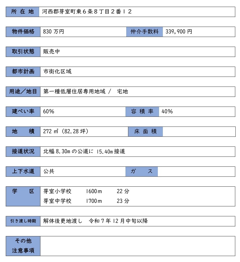 芽室町東6条売り土地(解体更地渡し) 830万円